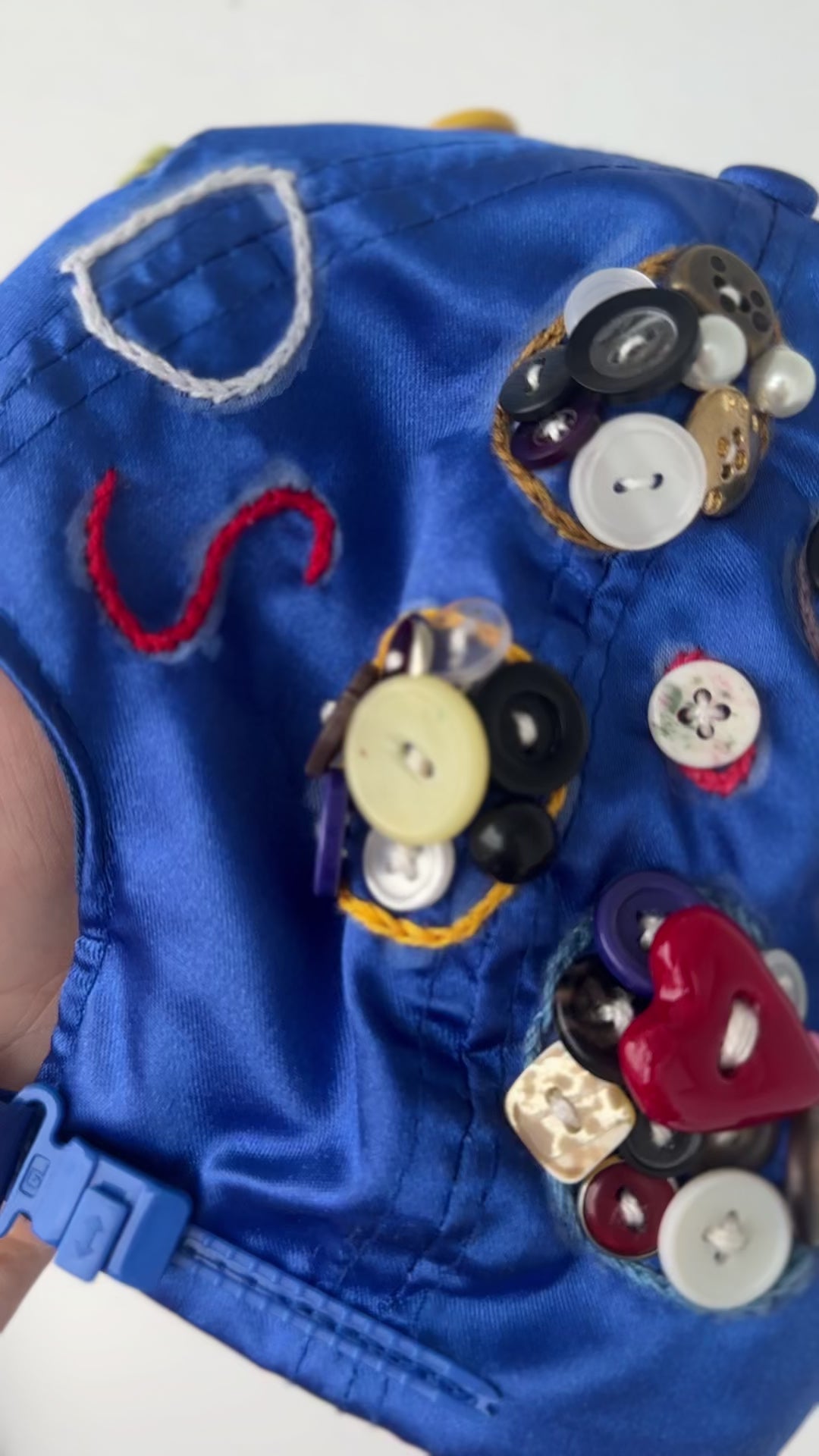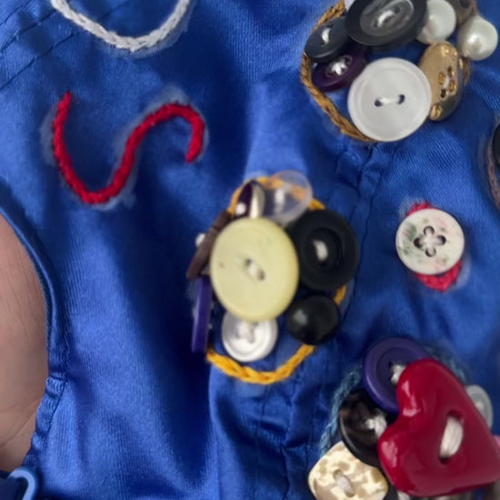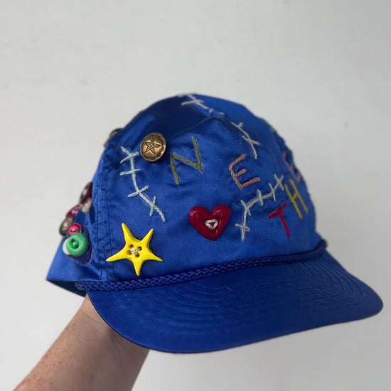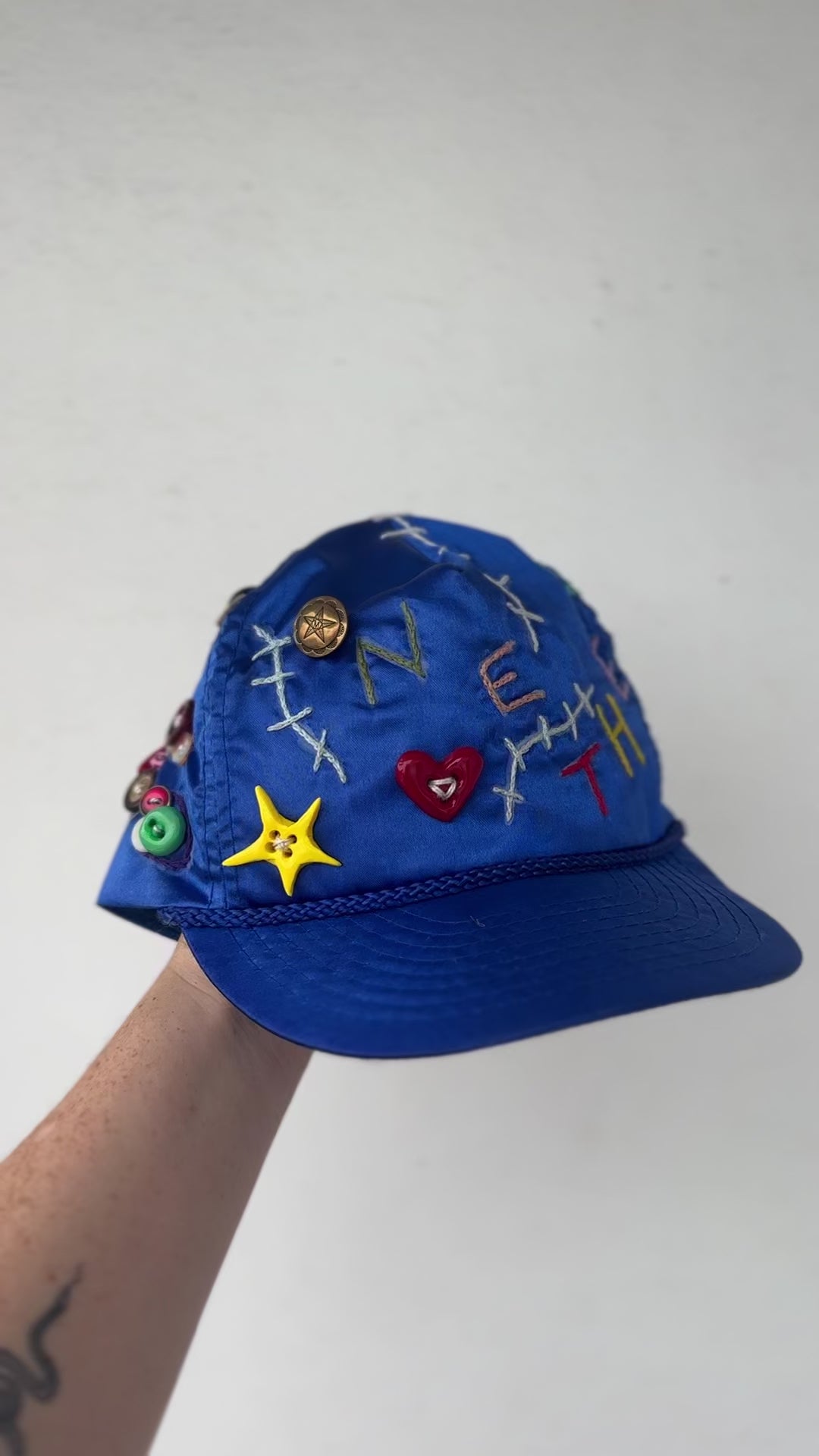 This vintage satin cap is the result of a unique partnership between Textile Styles and Netherfriends. It features an incredible array of buttons, hand-selected by Textile Styles, complemented by custom hand embroidery by Netherfriends. Complete with an adjustable strap. One size fits all.